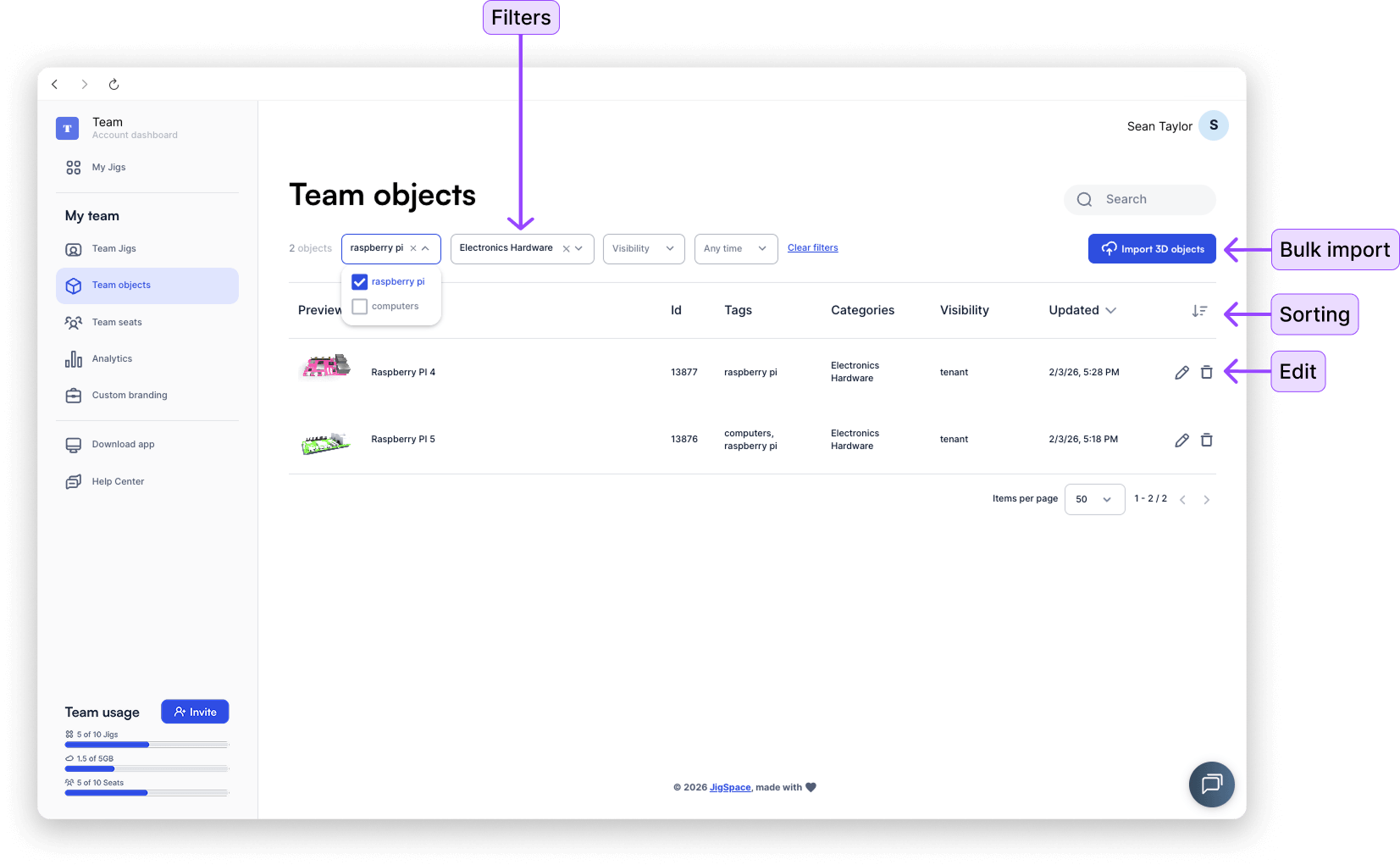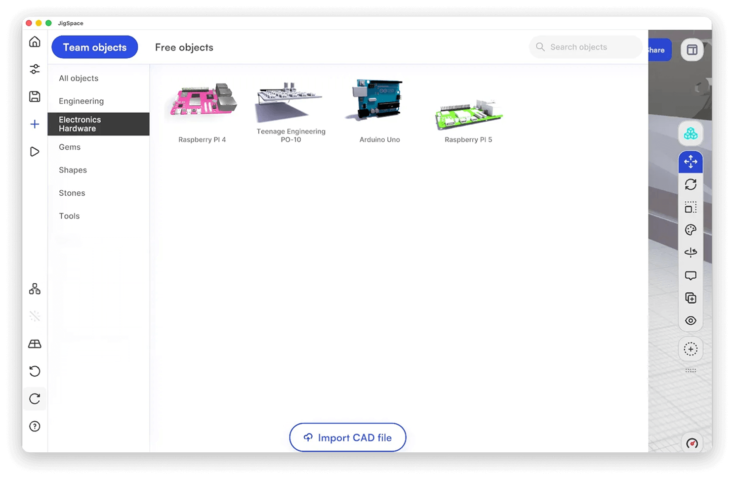 Your Team Object Library is a shared collection of 3D models and objects that you and your teammates can reuse across your Jig presentations. You can save models you've already enriched with materials, labels, and effects to this library, so nobody has to redo that work.