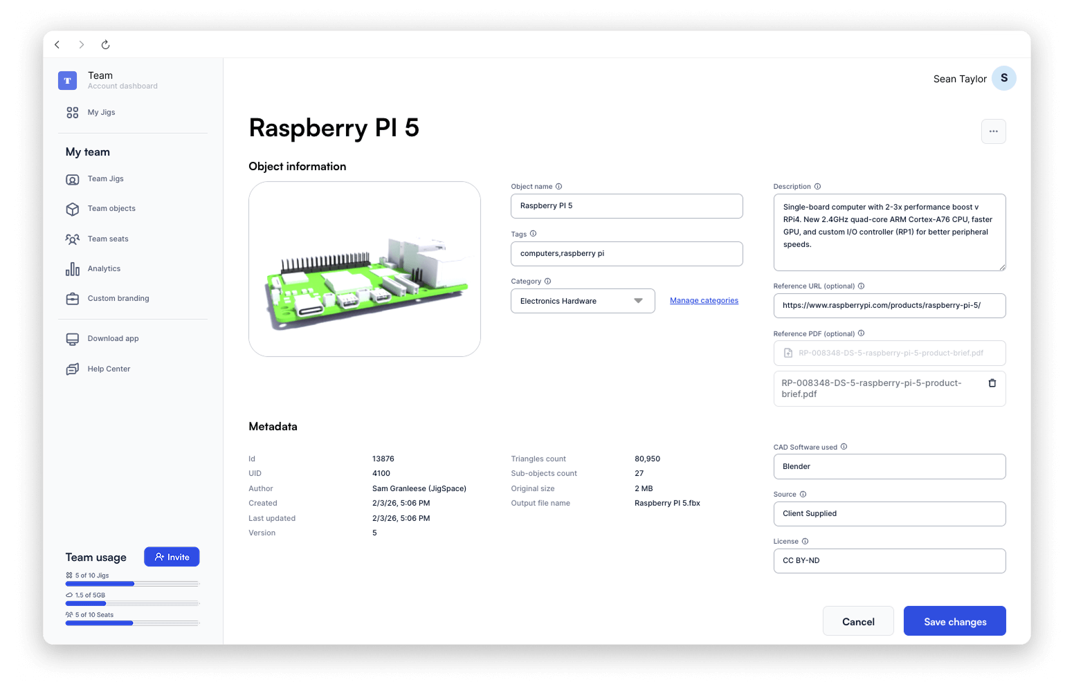 Select any 3D object in your Team Object Library to view and edit its metadata.