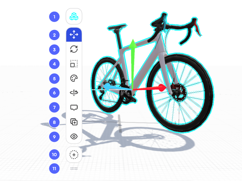 The Move tool {icon-move.svg} allows you to move a selected object in the x, y, z axis. You can move objects by clicking and dragging them, or by using the object property panel. Learn more.