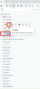 1. In the model tree, right-click each sub-assembly or component you want to simplify and select Open