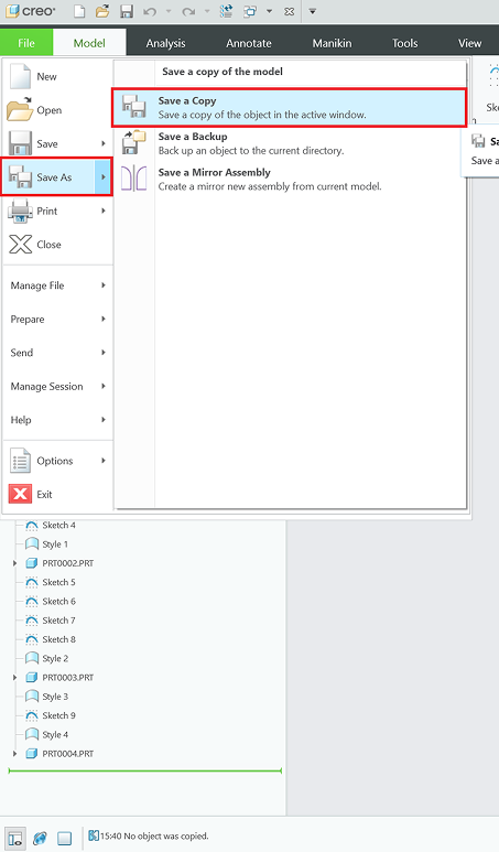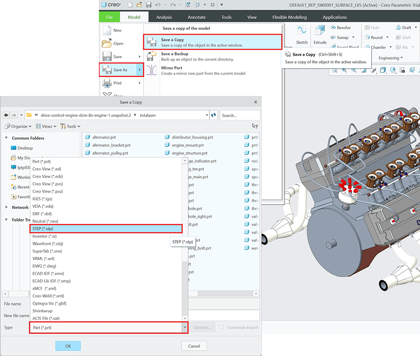 The following process works for both parts and assemblies in Creo. Due to the nature of file conversion, this approach is recommended to retain as much geometry and metadata as possible while giving you greater control over the output.