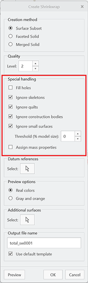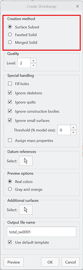 Choose from one of the three Shrinkwrap creation methods. We recommend using Surface Subset for visualization purposes, however there are uses for Faceted Solid and Merged Solid.