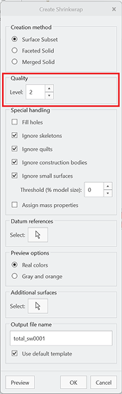 Set the Quality Level (1–10, where 1 is lowest and 10 is highest). You can adjust up or down depending on the level of detail needed in the Shrinkwrap output. As a general guide: