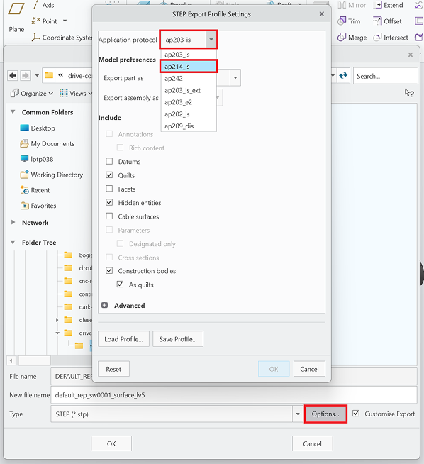 Before saving, click Options and choose AP214 as the application protocol before clicking OK.